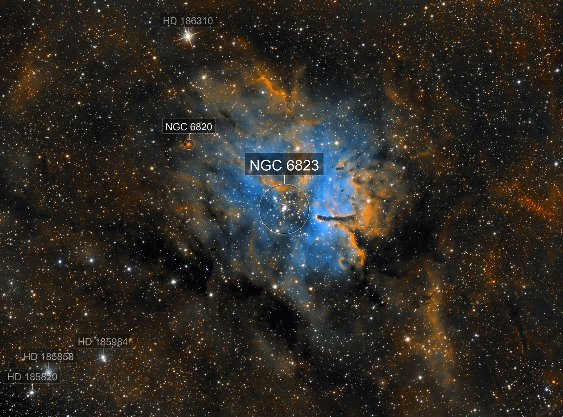 | Sh 2-86 (Sharpless 86) | Emission Nebula | Vulpecula | Often overshadowed by M27, this is a richly structured H II region associated with the open cluster NGC 6823. Great for narrowband imaging (H-alpha/SII/OIII). |