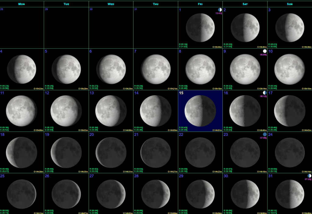 | 31 | 06:25 – First Quarter Moon |