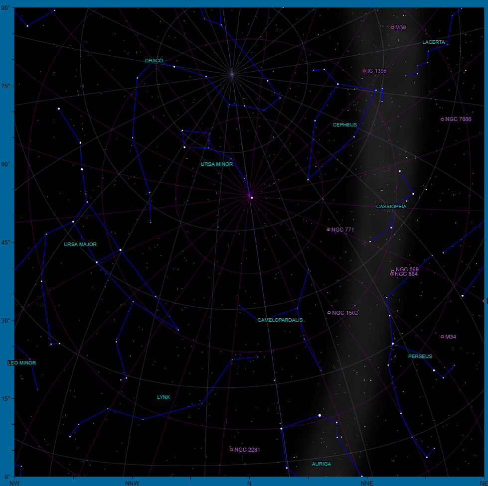 Cassiopeia and Cepheus lie deep in the Milky Way band near the zenith. Pegasus and Andromeda soar above the eastern horizon, with Pisces edging up below them. Deneb and Vega—two vertices of the Summer Triangle—are almost overhead.