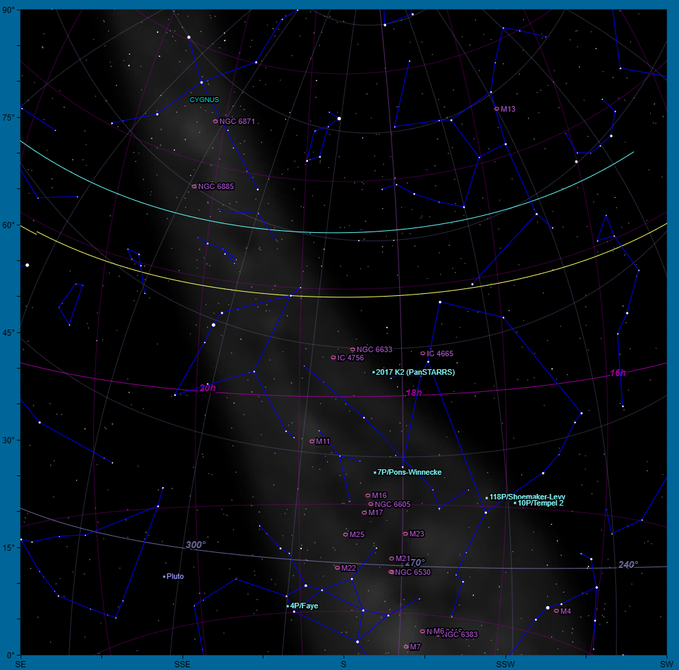 From Cygnus near the zenith, the Milky Way arches southward through Aquila (with Altair) down to Sagittarius’s “Teapot.” Nestled in the star clouds are the little constellations Vulpecula, Sagitta, Delphinus and Scutum (home to the binocular-friendly “Wild Duck” cluster M11), with Capricornus and Aquarius rising to the southeast.