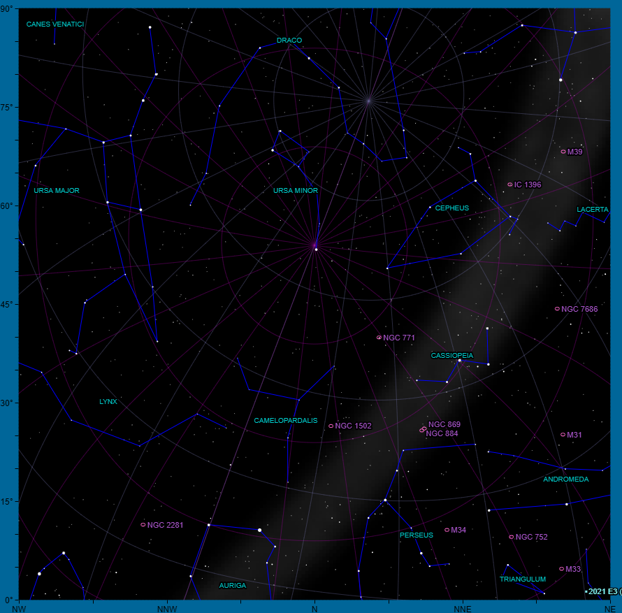In July, the nights remain light, with continued chances to observe noctilucent clouds. As the month progresses, particularly after midnight, the major constellations become more visible. Capella skims the northern horizon, while Cassiopeia and Perseus rise in the northeast, joined by the Milky Way stretching towards Cygnus. Pegasus and Andromeda are prominent in the east, and Draco lies near the zenith.