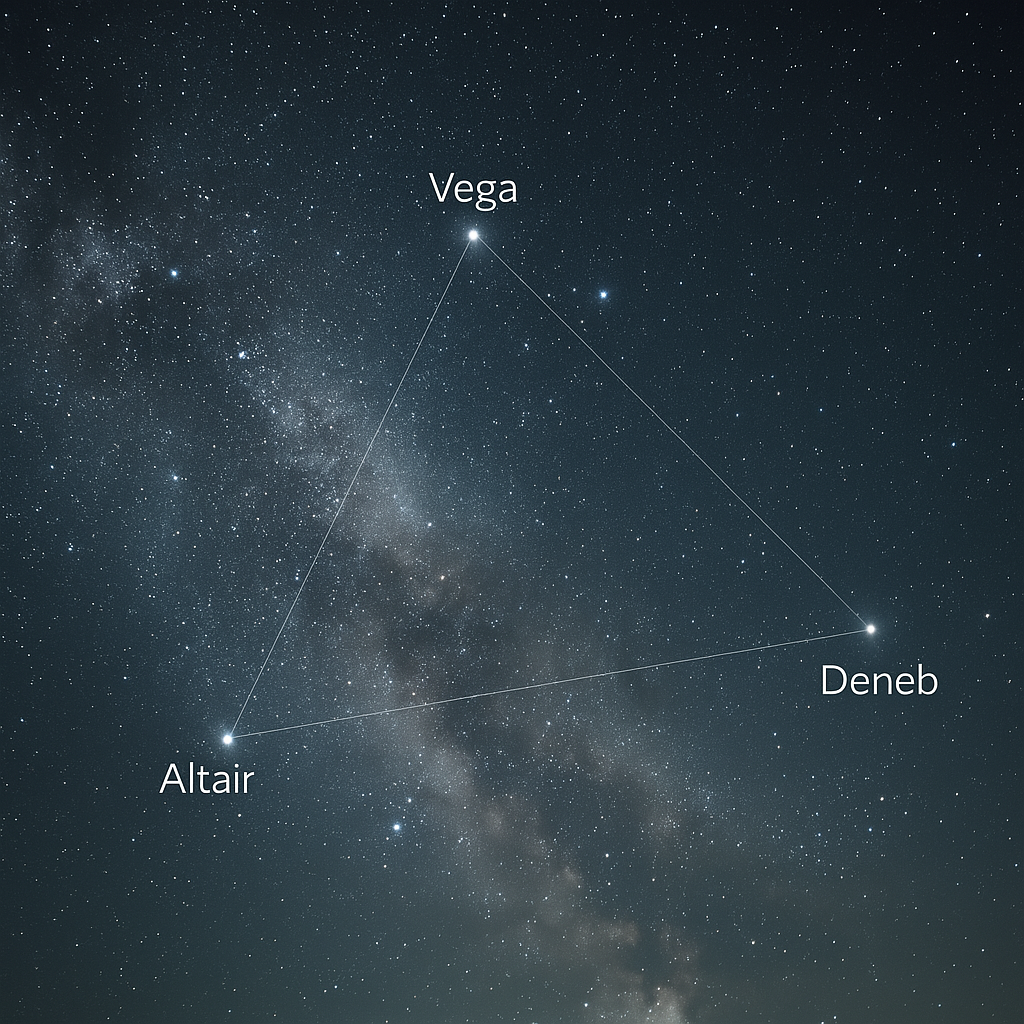 Scorpius, with red Antares, appears low in the south, while Sagittarius and the Milky Way’s dense core become visible around midnight. The Great Rift of dark dust clouds extends from Cygnus to Sagittarius. Nearby are Sagitta and the Dumbbell Nebula (M27) in Vulpecula. Ophiuchus is near the meridian, separating the two halves of Serpens. The Summer Triangle—Vega, Deneb, and Altair—rises in the south, with Lyra and its bright star Vega near the zenith.