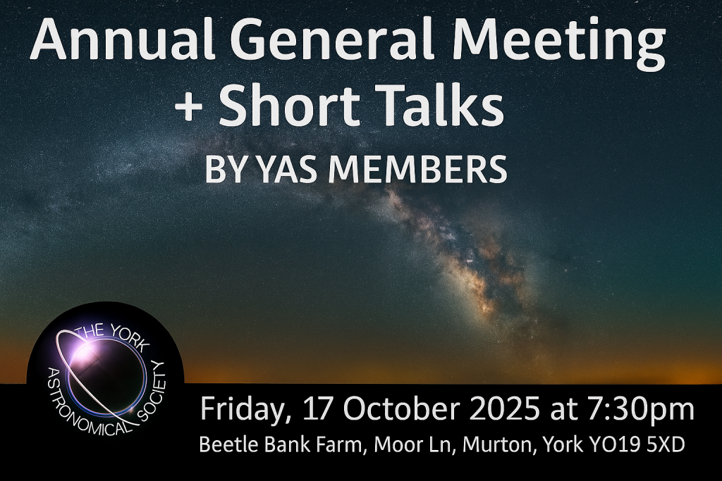 For further details see the events page Astronomy Presentations by guest speakers | York Astro and our Facebook group (20+) The York Astronomical Society Chat Group | Facebook