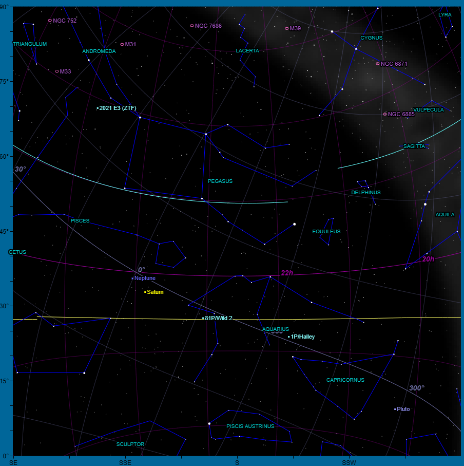 Looking south, the Great Square of Pegasus stands out, flanked by the stars of Pisces, with Alrescha marking the “knot” where its twin lines meet. Below lies Cetus, and further east, Aquarius is well placed, with Fomalhaut shining low near the southern horizon.