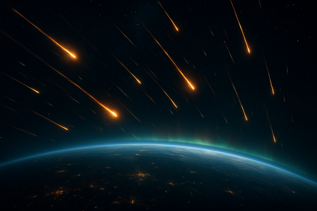 From orbit, Earth’s atmosphere glows as meteors burn in fiery arcs across the night side.
