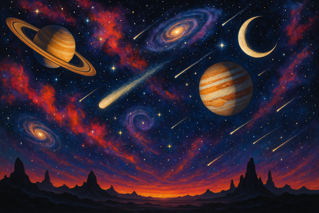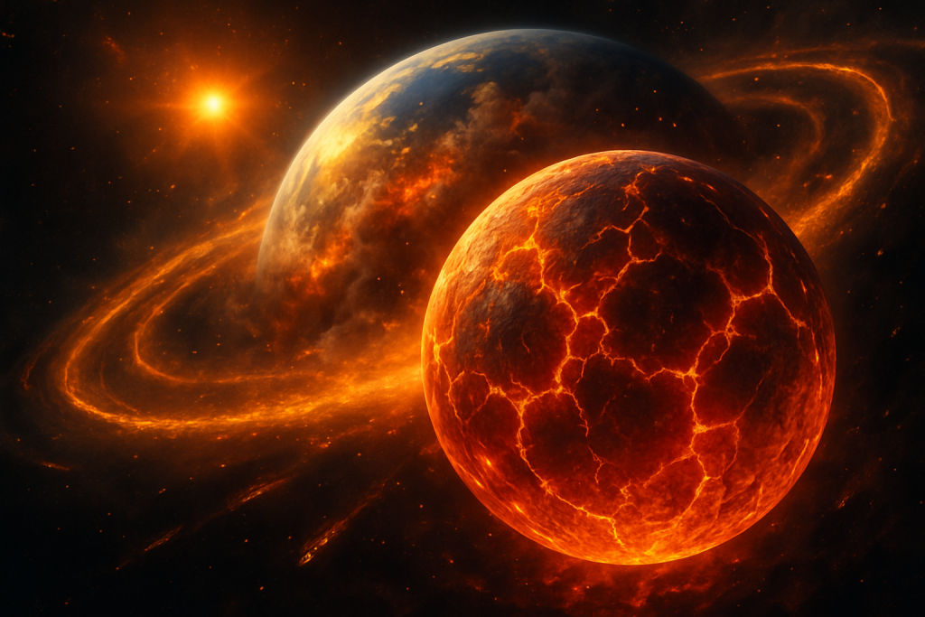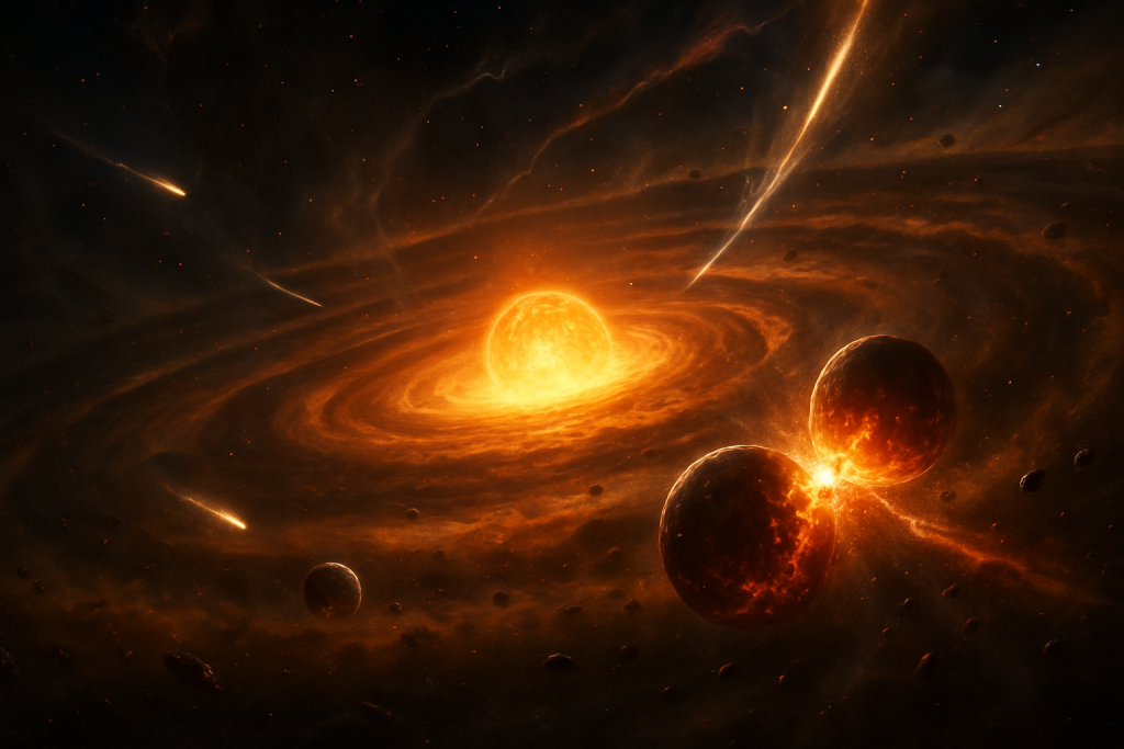 This image captures the violent beauty of the early solar system, with a blazing young Sun surrounded by a swirling disk of gas and dust. Within the chaos, fiery protoplanets collide and merge, laying the foundations for the worlds we know today.