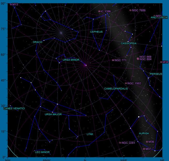 With the autumnal equinox on the 22nd, longer nights return. Ursa Major sinks low in the north, while Arcturus and Boötes drift toward the horizon. Auriga climbs in the northeast, followed later by Taurus and Gemini. Andromeda stands high in the east, with Triangulum and Aries below. The Milky Way arches overhead—its star clouds most visible in Cassiopeia and Cygnus. The Double Cluster in Perseus is well placed, with Cepheus near the zenith and Draco and Hercules (home to M13) nearby.