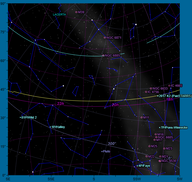 | Wild Duck Cluster (M11) | Open Cluster | 5.8 | Dense, fan-shaped cluster in Scutum. Best before it sets earlier in the night. |